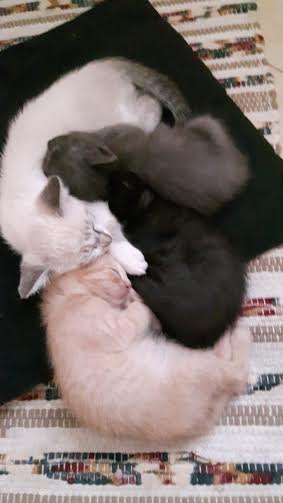 Infelizmente encontramos estes gatinhos bebes perto da sua mãe morta que tinha sido atropelada, acolhe-mo-los mas não podemos continuar com eles pois já temos muitos gatos. Os gatinhos são 3 machos (preto, laranja, cinzento) e 1 gatinha (branquinha com algumas listas bege e acinzentadas ). São gatos meigos, limpos e carinhosos que precisam de um novo lar.